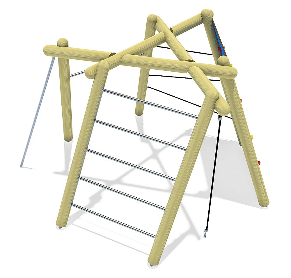 | Komplektacija | 1x laipiojimo siena: aukšto slėgio laminuota (HPL) 2x virvės konstrukcija: plastiku 1x kvadratas: nerūdijantis 1x slydimo juosta: nerūdijantis 1x sieniniai strypai: nerūdijantis Medinė konstrukcija: spygliuočių Stulpų kojos: cinkuotas plienas |