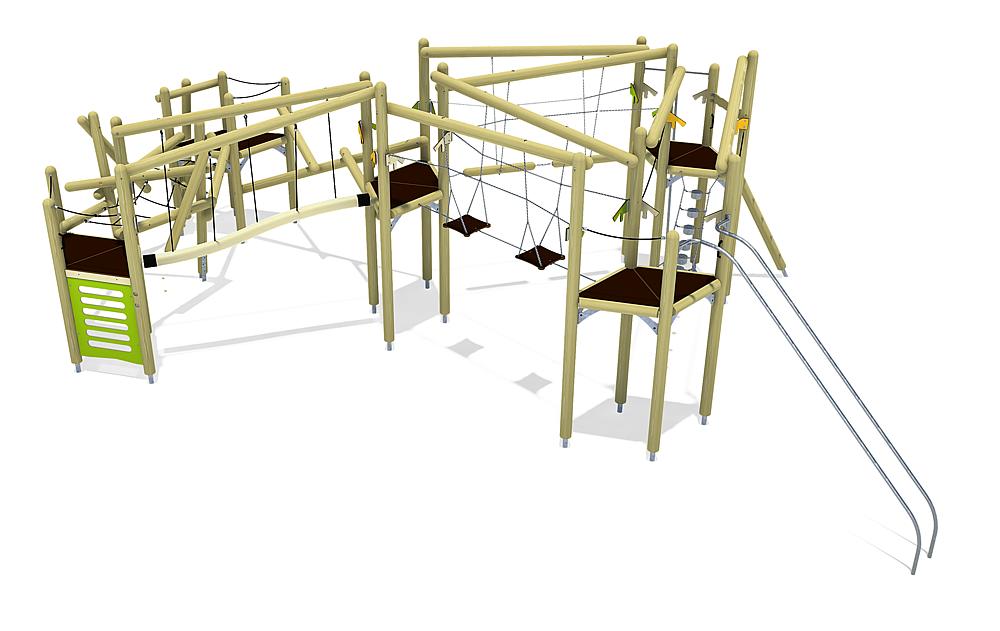 | Komplektacija | 20x stulpo konstrukcija: spygliuočių mediena arba plienas 10x platforma: aukšto slėgio laminatas (HPL) 1x prieiga prie bagažinės: spygliuočių 1x salos praėjimas tiesus: aukšto slėgio laminatas (HPL), nerūdijantis plienas (V2A), Spygliuočių mediena 1x laipiojimo tinklo tiltas: spygliuočių 1x tiesus grandininis polių praėjimas: spygliuočių mediena, nerūdijantis plienas (V2A) 1x tiesus išvertimo strypo praėjimas: spygliuočių mediena, nerūdijantis plienas (V2A) 1x praėjimo apsauga: Spygliuočių 5x praėjimo apsauga: plastiku dengtas plieninis trosas, nerūdijantis plienas (V2A) |