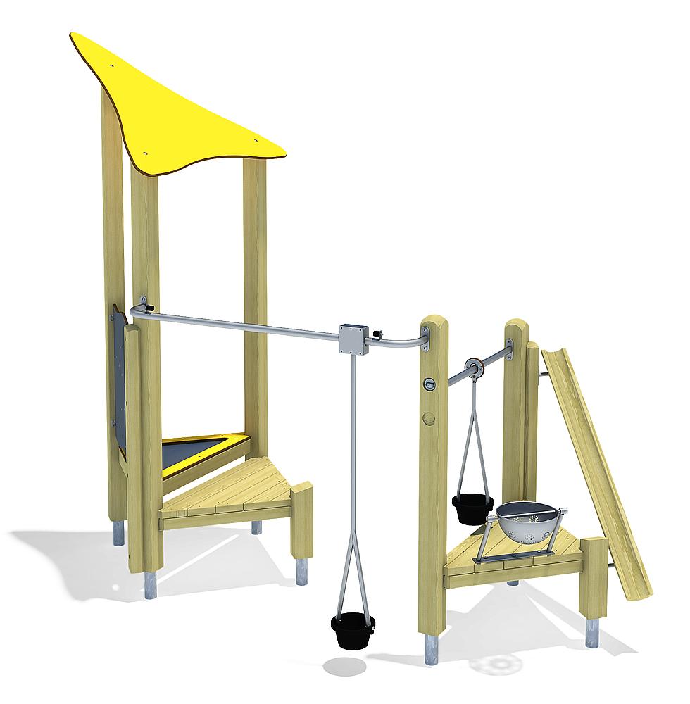 | Komplektacija | 2 vnt. adapteriai / jungiamieji elementai: spygliuočių mediena arba plienas 7 vnt. stulpų konstrukcijos: spygliuočių mediena arba plienas 2 vnt. platformų konstrukcijos: spygliuočių mediena 1 vnt. žaidybinė platforma su smėlio sietu: spygliuočių mediena, aukšto slėgio laminatas (HPL), nerūdijantis plienas (V2A) 1 vnt. trikampis stogas: aukšto slėgio laminatas (HPL) 1 vnt. žaidybinė smėlio latako parapetinė sienelė: spygliuočių mediena, aukšto slėgio laminatas (HPL) 1 vnt. smėlio transportavimo bėgelis: nerūdijantis plienas (V2A), guma 1 vnt. smėlio latakas: spygliuočių mediena 1 vnt. smėlio stumdiklis: nerūdijantis plienas (V2A), guma 1 vnt. smėlio sietas: nerūdijantis plienas (V2A) Tvirtinimo detalės: nerūdijantis plienas (V2A) |